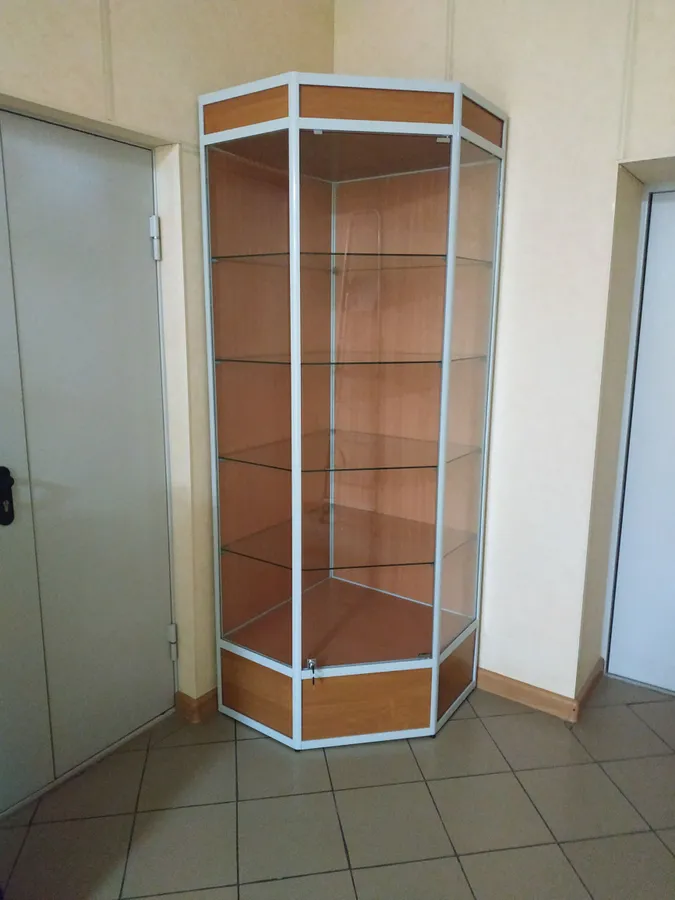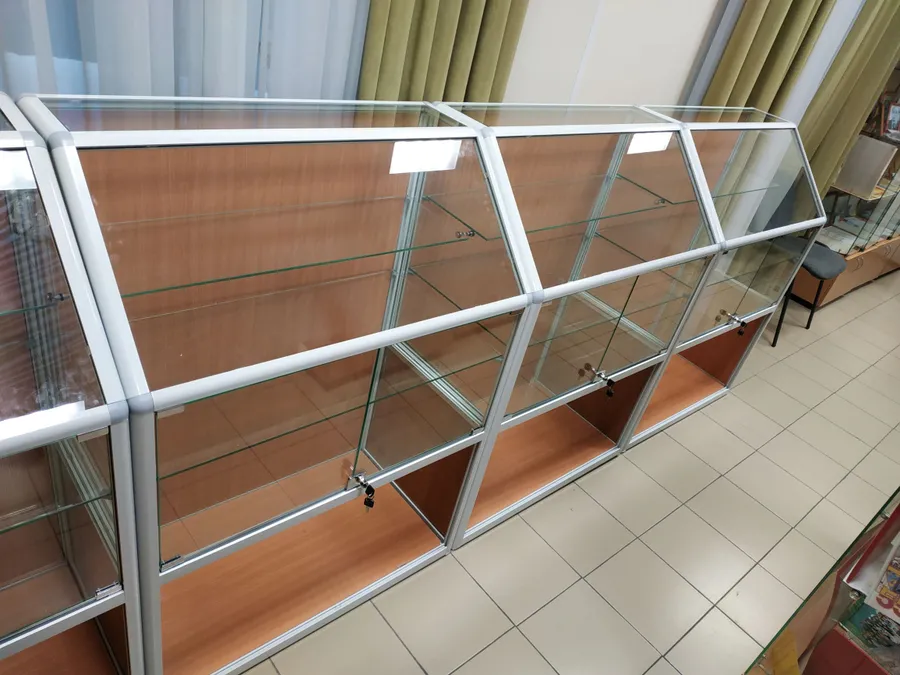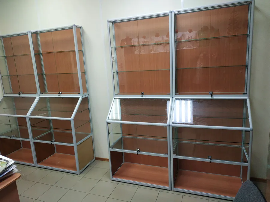 Витрины из алюминиевого профиля "Вико" Наполнение ЛДСП, ДВПО Бук. Двери стеклянные 5мм на замках.