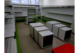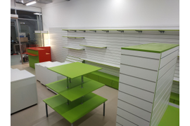 Магазин канцелярских товаров в ТЦ Лимон. ЛДСП Гринери, Чили, Солнечный, производителя Ламарти. Эконом панели белые, Abbot.
