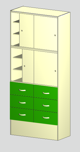 Стеллаж "ША-01" изготавливается из ЛДСП, нижняя тумба - ящики. Верхнее отделение закрытое - шторки раздвижные ХДФ 3мм.
